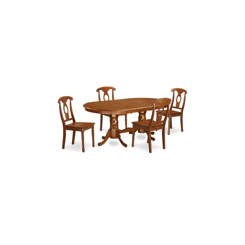This Plainville dining room table set boasts a beautiful finish possessing a countryside laid back feel. Joining together the simple care of a simple hardwood table top with vintage designed legs for the original look. The sleek oval dining room table top, which increases to 78\