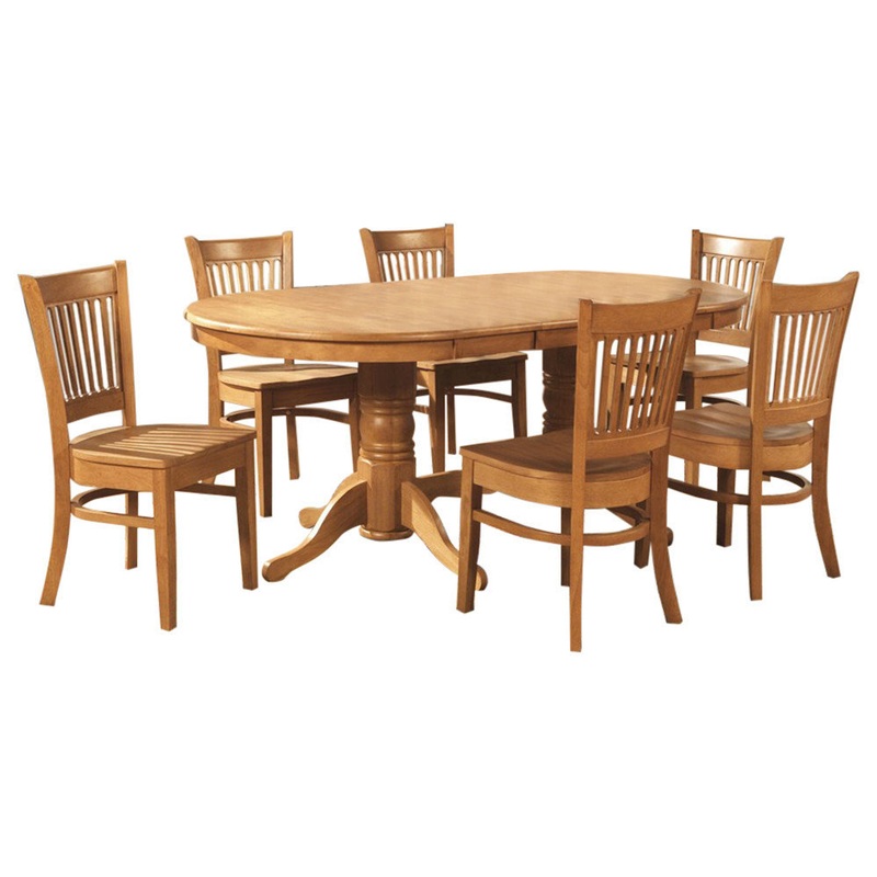 The Vancouver dining room table set features traditional fashion by way of an attractiveness deserving of formal dining and hosting those fantastic guest visitors. The oval-shaped small dining table shows spectacular design having its show-stopping double pedestals. Striking in a beautiful Oak finish, the dining room table set can be well-manufactured with distinctive Asian hardwood. Convenience of dining table is vital aspect in design having a18 inch self-storage extension leaf which makes a dining tables expansion a breeze. The slat-back dinette chairs are enticing with comfy wood or soft-cushioned seats.