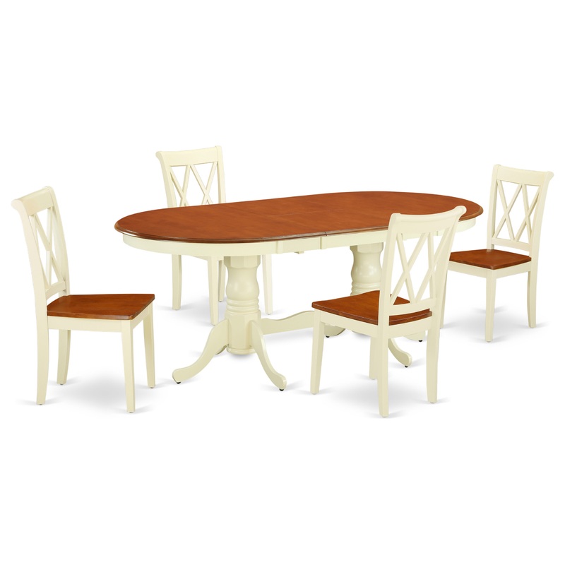 PVCL5-BMK-W 5PC Oval 60/78 inch Table with 18 In Leaf and 4 Double X back ChairsThis excellent PLCL5-BMK-W kitchen set features an amazing finish which has a country peaceful experience. The small kitchen table with built-in self-storage butterfly leaf which fits 4 to 8 persons. Dazzling solid wood table top with well-built carved pedestal support. Beveled oval shape to make welcoming kitchen space ambiance and finished in rich Buttermilk and Cherry, the small kitchen table can be acquired with hardwood or padded seat chairs. In-built self-storage butterfly leaf can be folded subtly underneath the tabletop when not being used and provides the greatest in flexibility for individuals who enjoy to set up modest, passionate dinners as well as full-out family affairs. Slender Double X back kitchen chairs finished in Buttermilk and Cherry color with wood seats present fashionable and cozy seating. Made up of hardwood, the chair is stable and offers a sturdy finish. The chairs add elegance and class to any place you have placed them. The frame of the chairs are engineered to offer a great amount of comfort to your spine and thus reduce the chances of back pain. The matching color of the chair with the table brings a good contrast in the kitchen area. Buttermilk and Cherry finish bench matches well with both the table and the chairs. The standard shape, size and design makes the dining area significantly attractive. This contemporary, budget friendly, durable and comfortable dining set can be good choice if you are looking for a great dining time experience with your family or friends.