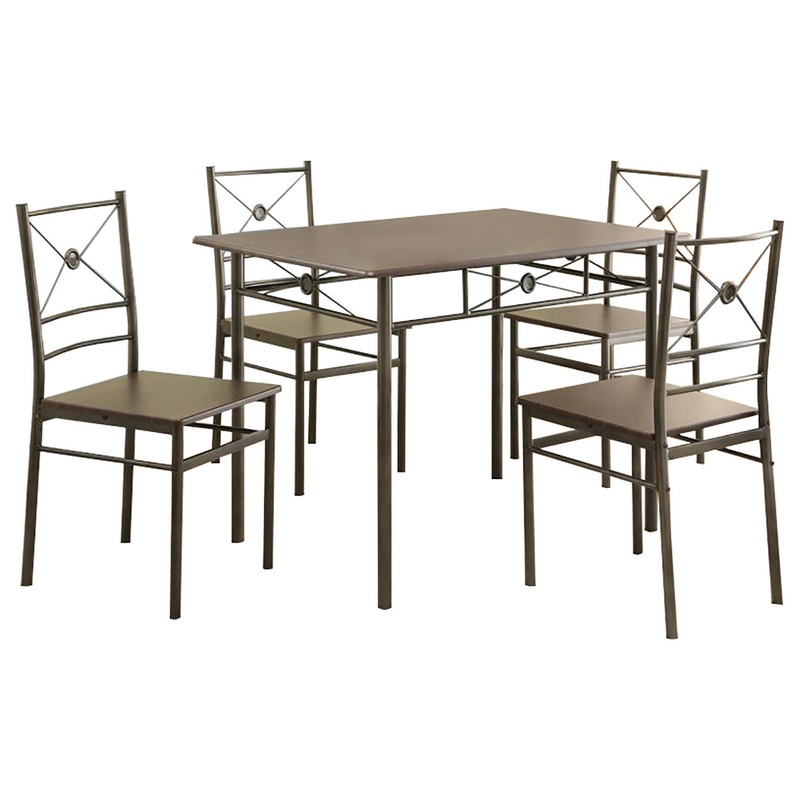 This stylish dining set with 4 side chairs and a table. Wooden tops, and frames are crafted from strong metal tubing, ensure the stability while keeping aesthetics. Finished in dark bronze color with simple structure, making it textured and eye-catching. T