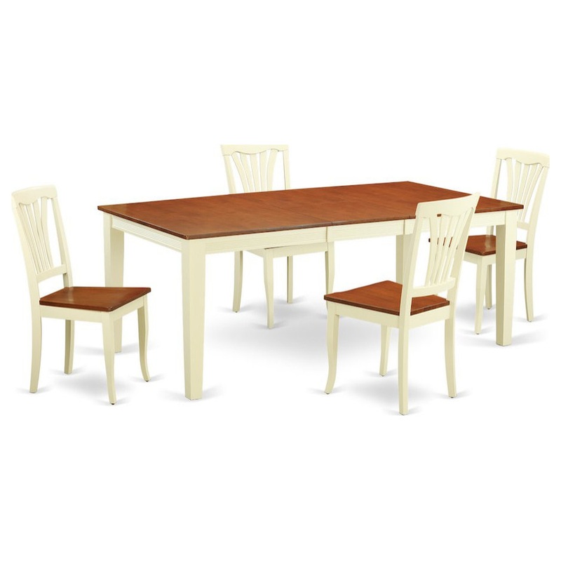 -This 5 piece dining set Includes dining table and 4 wood seat dining room chairs finished in Buttermilk and Cherry.