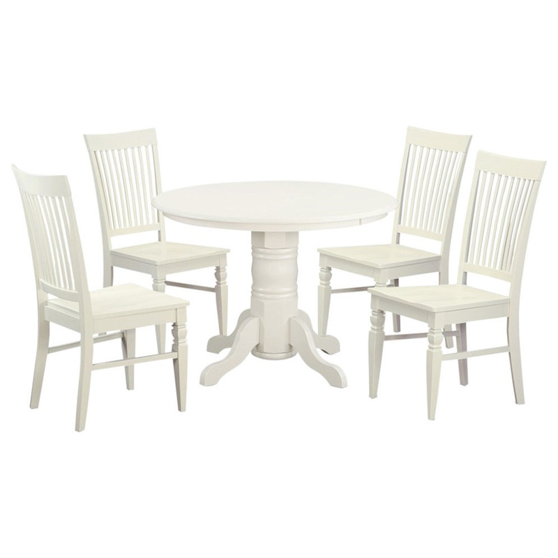 -Package Includes: 5 piece Shelton round kitchen table 42in Diameter with 4 Weston Dining Chair With Wood Seat in a Linen White Finish.