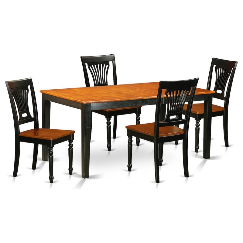 -This 5 piece dining set Includes dining table and 4 wood seat dining room chairs finished in Black and Cherry.