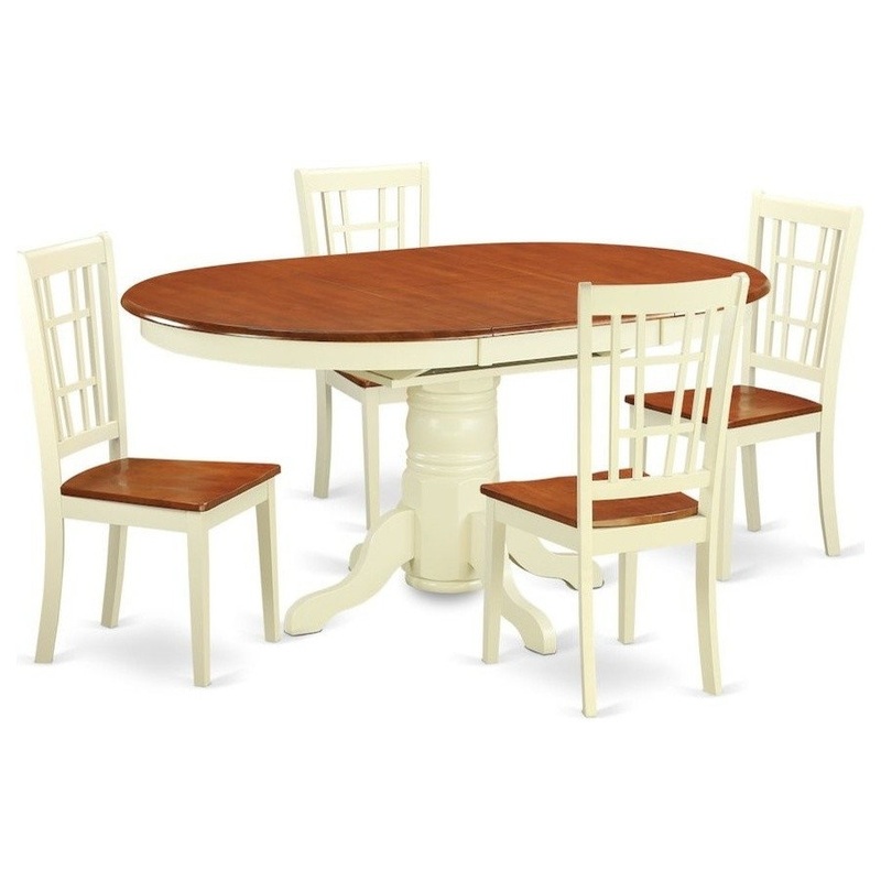 -This 5 piece dining set Includes dining table and 4 wood seat dining room chairs finished in Buttermilk and Cherry.