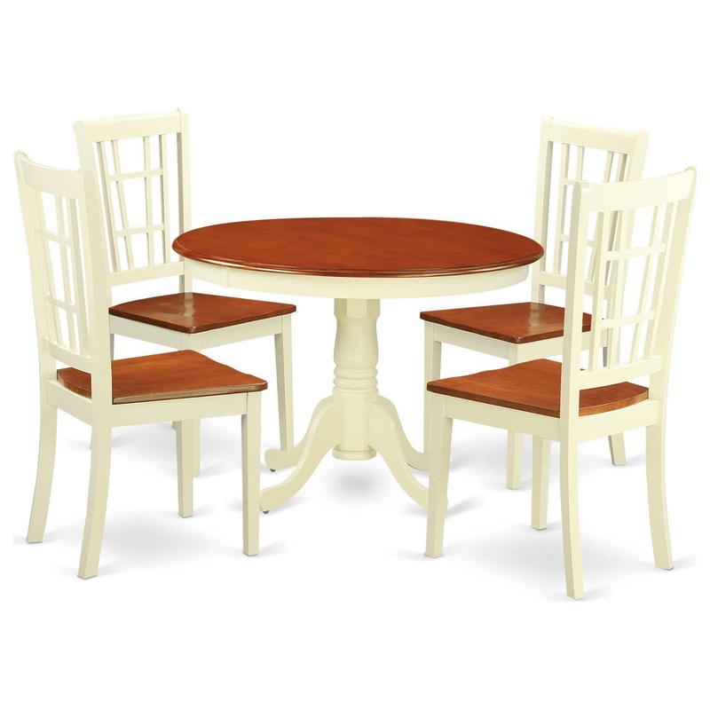 -This 5 piece table and chair set Includes dining table & 4 wood seat dining chairs. -Fine quality set for dining room which constructed with 100% Asian Hardwood. Completely no MDF, veneer, laminate made use of in our items. -This 42 inch circular tabletop