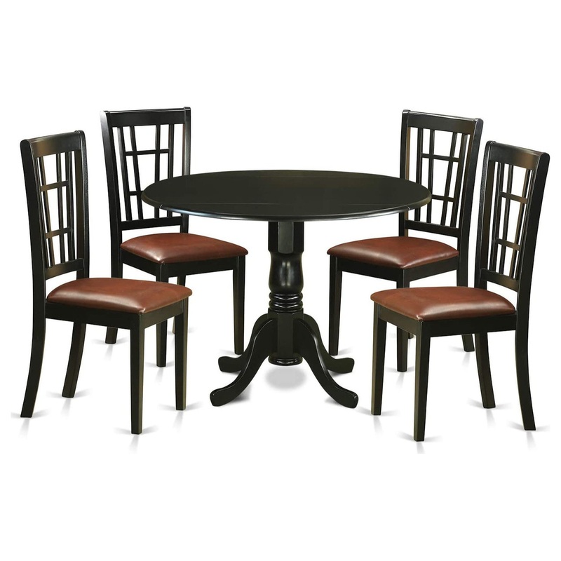 -5 piece kitchen Round Table with Drop Leaves and 4 Faux leather Seat Chairs in a Black Finish -Round kitchen table features two 9-Inch Drop Leaves. Perfect for small kitchen spaces. -All solid wood from dining table top to table legs. No heat treated pres
