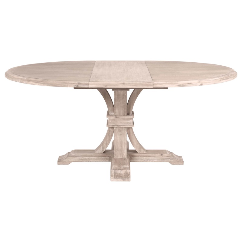 -54-72″ Solid Wood Round Extension Dining Table Natural Gray AcaciaTransitional style round extension dining table featuring Solid Acacia base and distressed Natural Gray finish. Tradition Collection Acacia Veneer finish is sandblasted to create a rustic appearance. This process accentuates the natural grain of the wood and creates a variation in both color and texture. The existence of natural knots, cracks, scratches, and marks in the surface of the wood should be expected. By ordering products from this collection, you accept the natural characteristics unique to each item and agree that no claims will be approved regarding these natural variations. Special care should be taken to protect this finish.