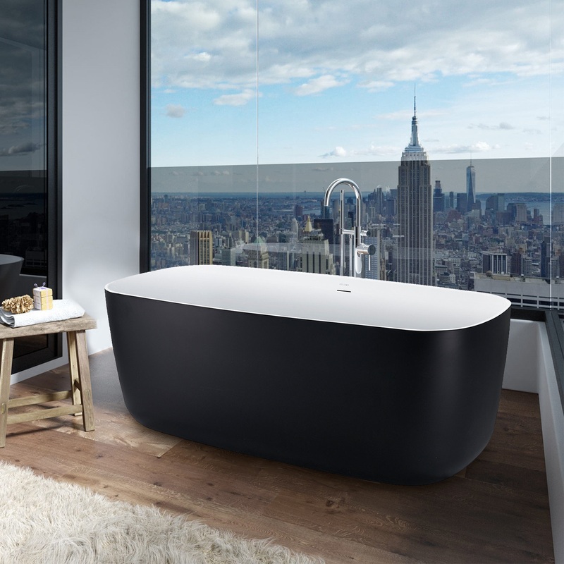 White inside and black outside, the 100% glossy white acrylic is reinforced with fiberglass for long-lasting durability, environmentally friendly material, non-toxic, non-cracking, high gloss. The bathtub allows for dynamic curvatures and for crisp, hand-f