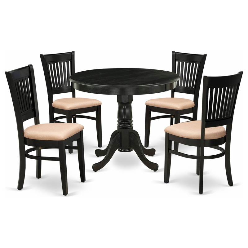 This 5-piece dinette set includes 4 dining room chairs and 1 modern kitchen table. These wooden chairs have a Linen Fabric seat, Slatted Chair Back, and the kitchen dining table includes a round tabletop and pedestal Legs. We have produced these dining roo