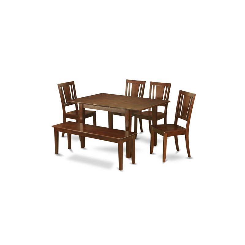 -6-Piece dining room set with rectangular dining room table offers 12 in butterfly leaf and 4 Dudley wood seat chairs and 52 in long dining bench