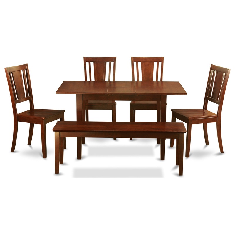 -Norfolk 6 piece set with rectangular table featured 12 in butterfly leaf and 4 wood seat chairs plus one 51 in long bench