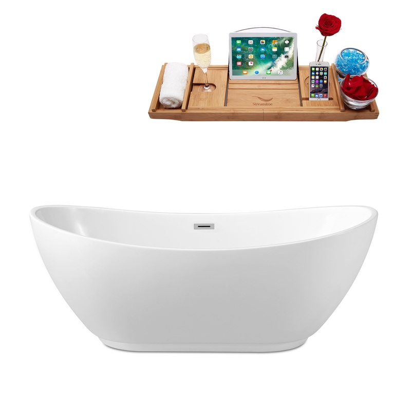 Enhance your bathroom with this luxurious Streamline 62″ double slipper style freestanding bathtub. Its modern glossy white exterior and unique wedged edges it a sleek. This tub was designed with an internal drain and can hold up 53gallons of water. FREE Bamboo Bathtub Caddy Included in Purchase!