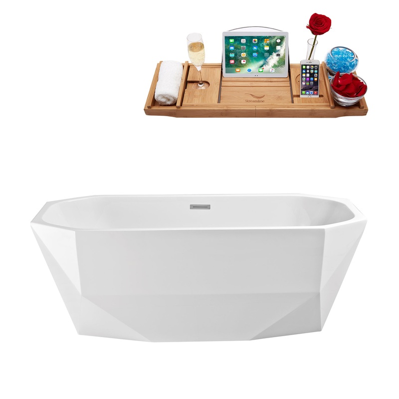 This beautiful Streamline 63″ diamond cut style bathtub is sure to become the focus of your bathroom. Its glossy white finish and unique exterior shape will add a modern touch to your bathroom. Designed with an internal drain and plenty of internal space you can soak in up to 63gallons of water. FREE Bamboo Bathtub Caddy Included in Purchase!