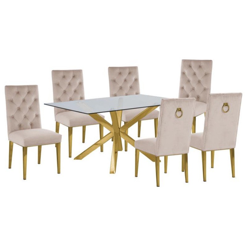 Complete 7 piece dining set with a table and 6 chairs. The dining table features a 63" x 39" 10mm clear glass top and a gold stainless steel base. The chairs are upholstered with Cream velvet with a matching gold base. These chairs are also available in co