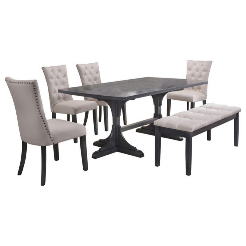 Complete 6 piece dining set with a table, bench, and 4 chairs. Each piece is constructed with smooth dark gray wood, and the chairs and bench are upholstered with light gray linen fabric with tufted seats. This dining set is perfect for any traditional or modern styled home. Assembly is required.