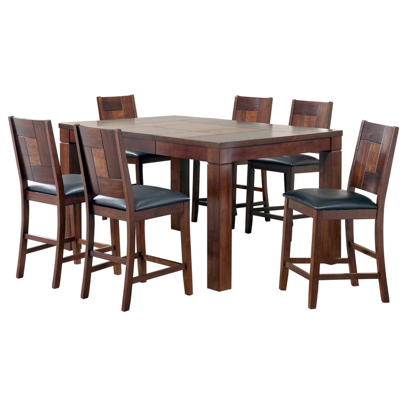 Give fine craftsmanship a seat at the table with this seven-piece dining pub table set. The solid hardwood construction with warm walnut veneers and inlays bring an elegance to this wood dining table set that will stand the test of time. The butterfly leaf