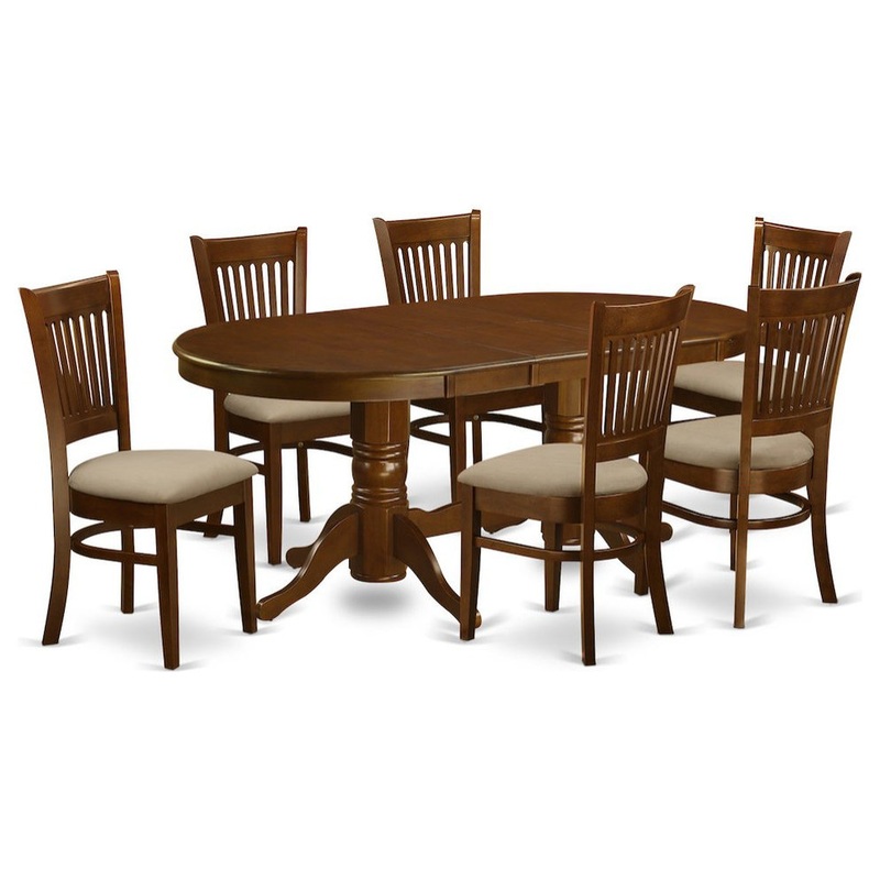 -Package Includes: Vancouver 7 piece set with double pedestal oval featured 17in butterfly leaf and 6 Microfiber Upholstered seat chairs