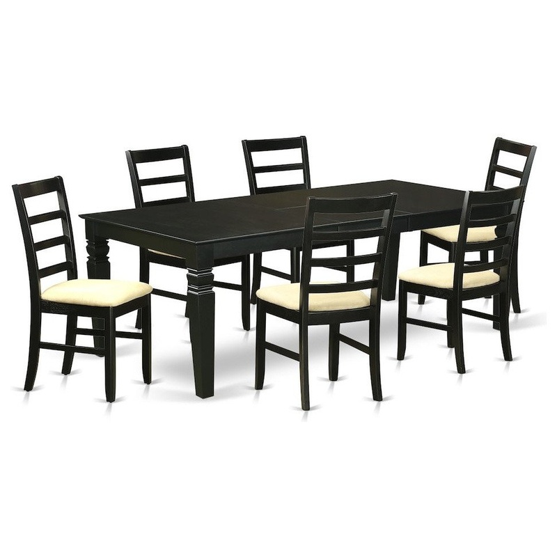 This beautiful dining room set is similar to timeless missionary design and ads an elegant, modern touch to any kitchen area or dining area. This particular seven piece dining room table set with one table and six dining room chairs. High quality kitchen set which made out of 100% asian hardwood. Simply no mdf, veneer, laminate include with our items. The table features integrated 18 in self storage extension leaf which can be stored right beneath table top. The rectangular kitchen table is finished in a warm, high shine black that is easy to maintain and polish. This dining room table features stable square legs with carved decor and plenty of space for individual comfort. The straight back chairs are great for both formal and casual get together. 7 pc kitchen set with a single logan dining room table and six microfiber upholstery kitchen chairs finished in a luxurious black color.