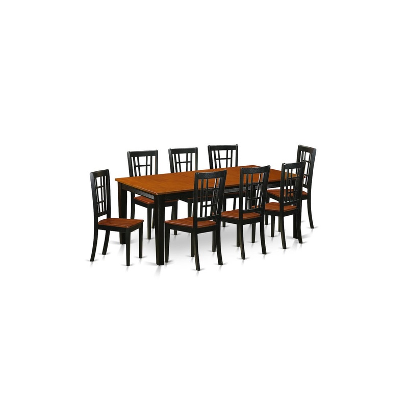 -Package Includes: This 9 piece dinette set Includes dining table and 8 wood seat dining room chairs finished in Black and Cherry