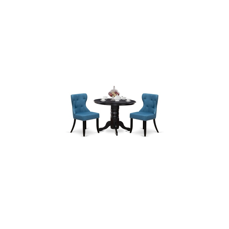 -This dining room table set abilities comfy Linen Fabric Mineral Blue color, the frame of these parson dining chairs and the wonderful mid-century dining table is built from premium quality Black color finish wood, which produces the best choice quality color combination to give a luxurious gaze to your kitchen.