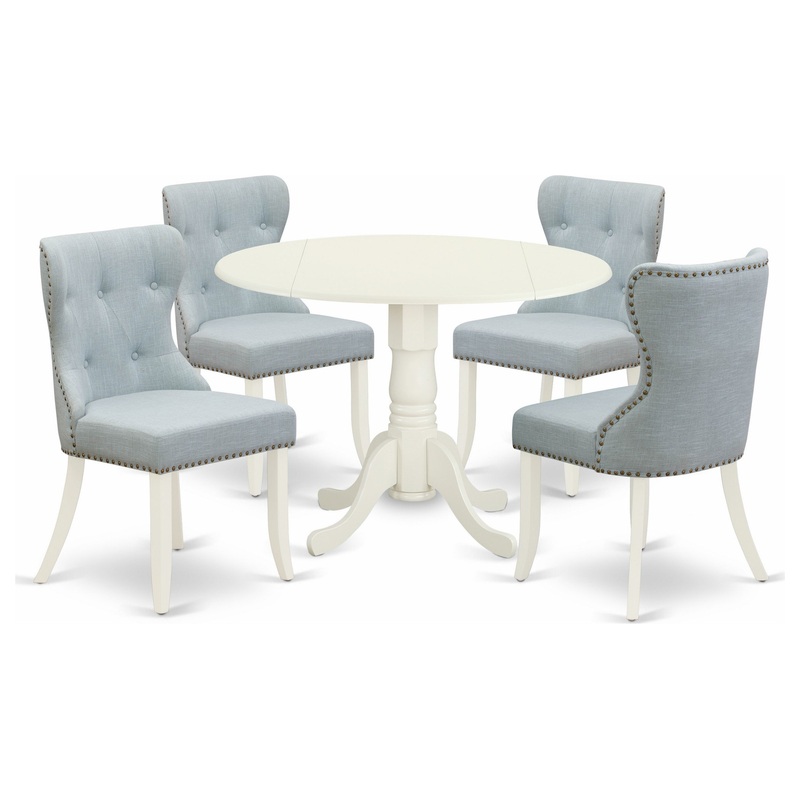 -This pedestal kitchen table set abilities comfy Linen Fabric Baby Blue color, the structure of these kitchen dining chairs and the attractive wooden dining table is built from superior quality Linen White color finish wood, which produces the perfect quality color combination to give a luxurious gaze to your kitchen.