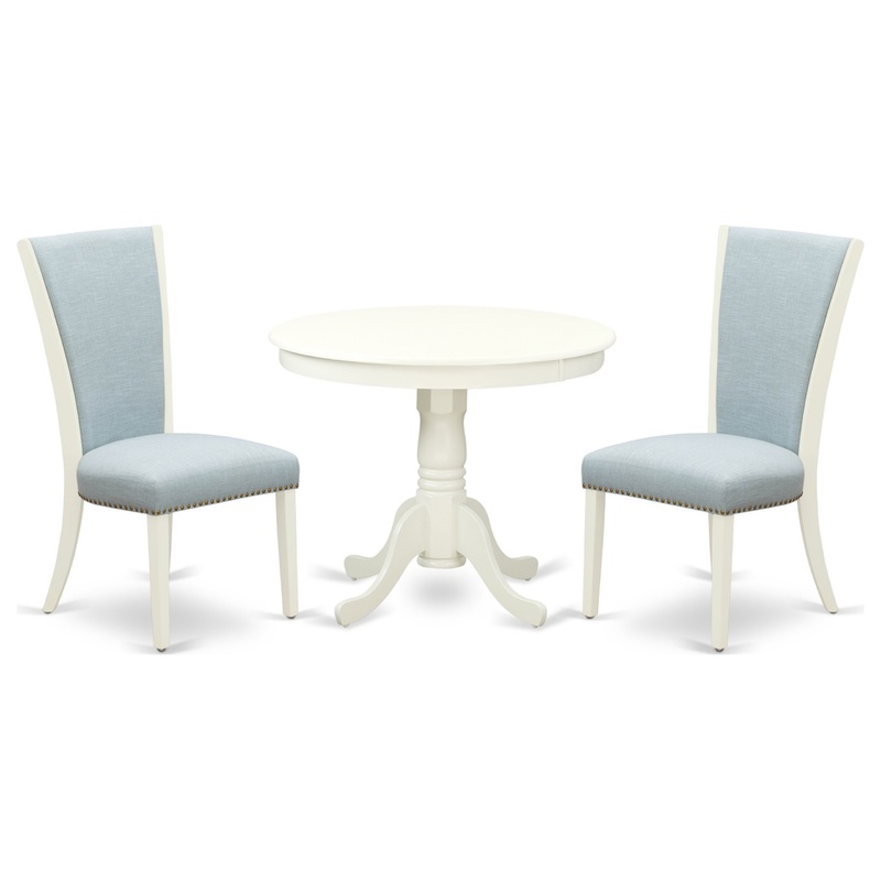 -This kitchen dining table set functions comfortable Linen Fabric Baby Blue color, the structure of these parson chairs and the attractive 36-Inch Antique dining room table is built from top quality Linen White color finish wood, which creates the perfect quality color combination to give a luxurious gaze to your kitchen.