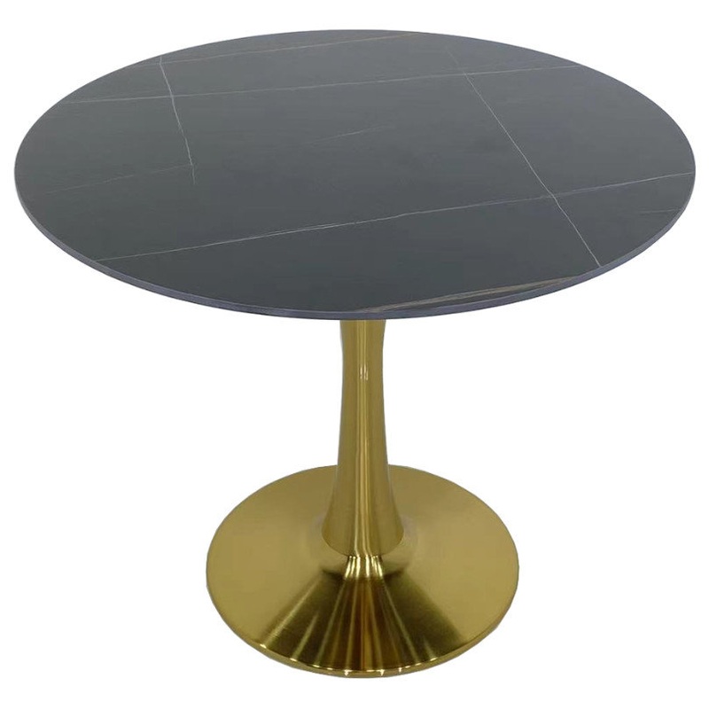 Bring your breakfast nook into the 21st century with this streamlined dining table. The base is crafted from steel with a brushed brass finish to match the color of the tabletop. Its circular top is made from sintered stone and measures 35.5 in diameter to