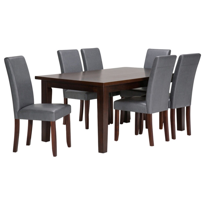 Elevate your dining space with this dining set, featuring the robust 66-inch rectangular Eastwood rubberwood dining table paired with Acadian Parson Dining Chairs. The java brown table showcases a thick top and tapered legs, highlighting the wood’s natural beauty. Complementing the table are Stone Grey vegan leather chairs, offering both style and comfort with their high backs and plush foam cushioning. This set seamlessly blends modern and classic aesthetics, perfect for family gatherings or elegant dinners. The solid wood construction ensures durability, while the chairs’ easy-clean upholstery adds practicality. With simple assembly required, this 6-person dining set brings functional elegance to your home, promising years of memorable meals and conversations in a stylish, comfortable setting.