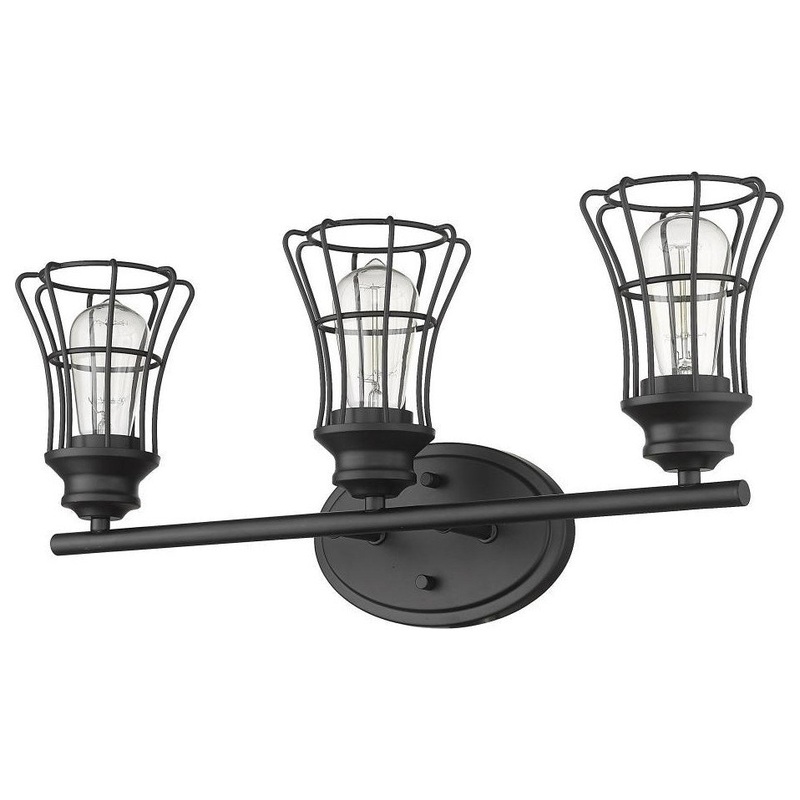 Piers features metal framework reminiscent of the workshop with soft styling that is perfect for the bath. The oil-rubbed bronze or matte black finish continues onto the metal cage shades. Piers may be mounted in an upward or downward position. -Matte Blac