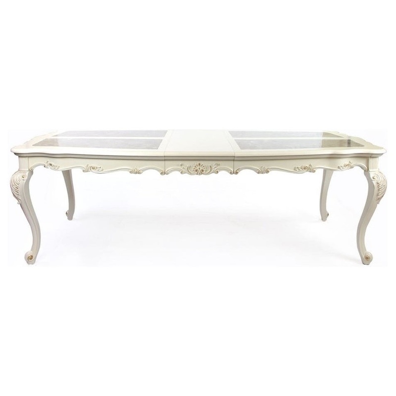 ACME Chantelle Leg Dining Table in Pearl White 63540 -Chantelle Collection by ACME Furniture -Pearl White finish -Poplar wood -Birch veneer -Marble top Scrolled details -Includes 1 16" leaf 80W x 44D x 30H (closed) -96W x 44D x 30H (one leaf)Product ID9619