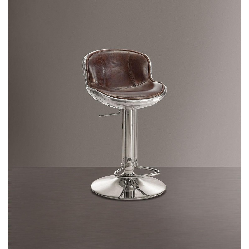 Brancaster Collection by Acme Furniture Vintage Brown finish Swivel stool Low backrest Adjustable height- Counter up to Bar Padded bucket Top grain leather seat Aluminum patchwork Round metal base and footrest support