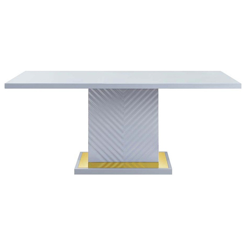 Description: The sleek clean-lined table Gaines dining table offers subtle a hint of glam, the base offers a touch of gold to enhance the textured vertical lined pedestal. The gray high gloss finish reflects light and makes any dining space appear larger a
