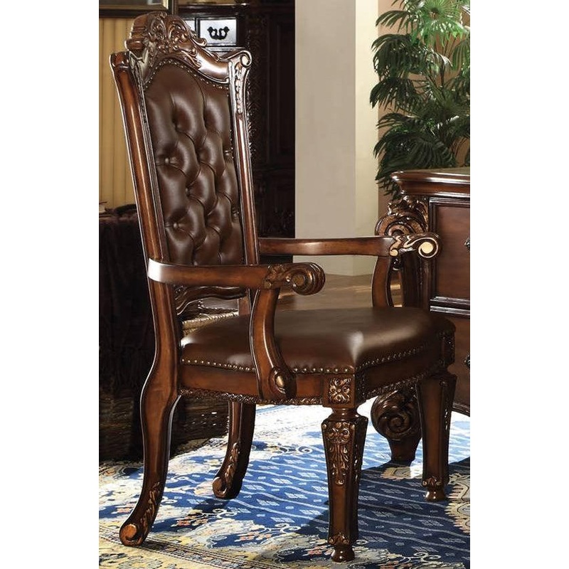 Cherry finish Crafted from wood veneers & solids Carved wood details on table edges and chair legs Scroll and carved details, deep tufting and nailhead trim Durable construction Office arm chair