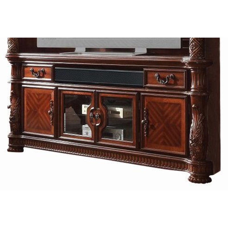 Vendome Collection by ACME Traditional style Cherry oak finish Intricate carved accents on crown and sides Brushed by hand gold leaf accents 2 Wooden side doors 2 Glass doors w/ shelf behind Open compartment for media consoles Decorative metal hardware Car