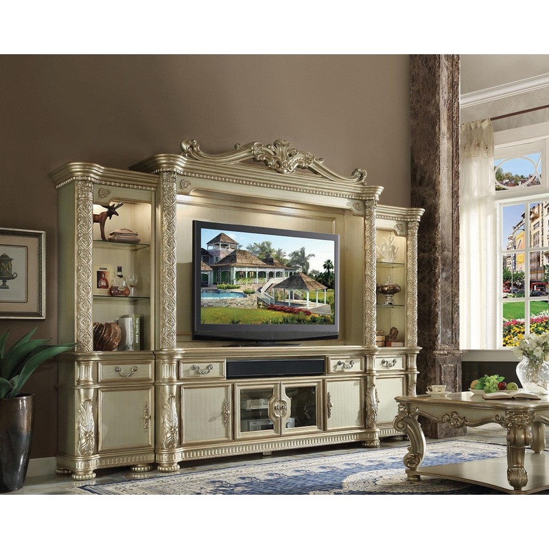 Vendome Collection by ACME Traditional style Golden patina finish Intricate carved accents on crown and sides Brushed by hand gold leaf accents 2 Wooden side doors 2 Glass doors w/ shelf behind Open compartment for media consoles Decorative metal hardware