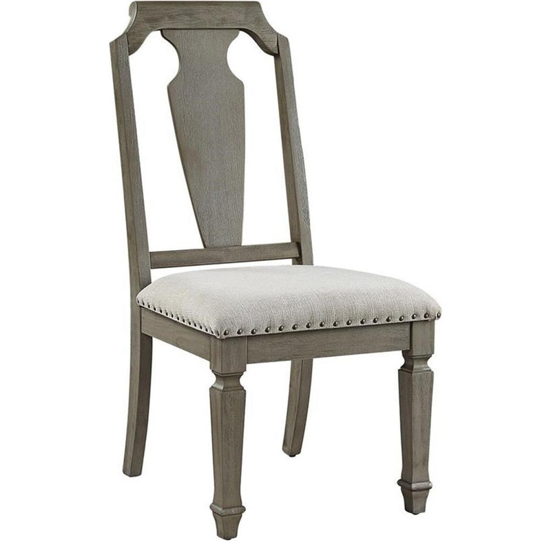 Shown in a weathered oak finish, the side chair has a wooden carved frame designed with a classic fiddle back for creating a cozy and timeless look. Beige linen upholstery boasts soft texture and airy feel while nail head accents around the seat enhance th