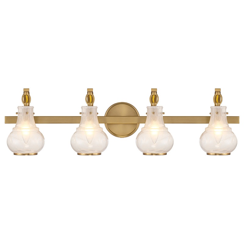 For the Adams 4-light bath vanity light, Savoy House took traditional lighting style and gave it a fashionable twist for today’s stylish homes! Molded, curving shades of white strie glass offer an extra touch of eye-catching detail to go with the warm brass finish. Adams is 8.75″ in height, 32″ in width and extends 7″ from the wall. Uses 4 candelabra size bulbs with a max of 60 watts per bulb (bulbs not included).