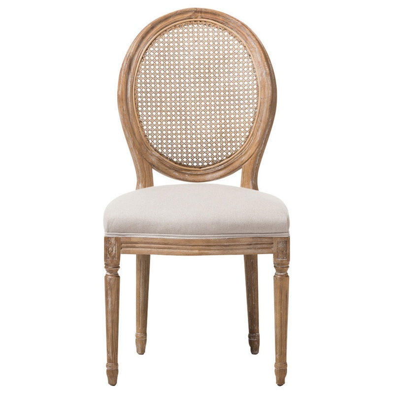 Reflecting the Old World glamour classic French design, The Adelia dining side chair captures a touch of French flair for the dining room table. Beautiful woodwork details its fluted legs and classic oval-caned backrest, while a distressed weathered oak ef