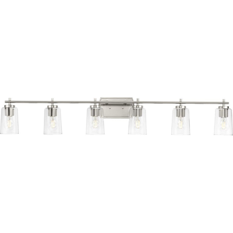 Fundamentally modern but with a traditional twist, the Adley six-light combines simple, clear glass shades with a curved edge backplate. A brushed nickel, curved backplate and simple, straight bar hold classic, clear glass shades, making it an excellent choice for new traditional and transitional settings.