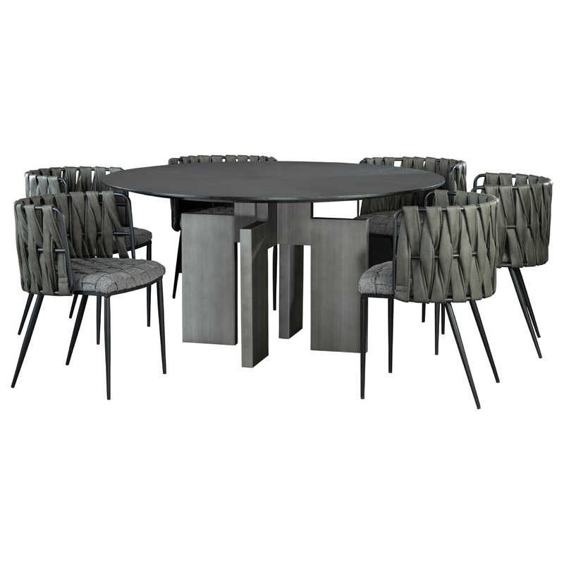 Indulge in artful dining with the Adonis Round Dining Table Set for 6. Made with wood veneer and iron powder, this sculptural masterpiece dining table adds a touch of elegance to any space. Embrace your inner artist and elevate your dining experience with this bold geometric dining table set that comes with 6 gray and black chairs.