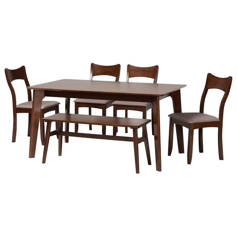 Evoking the style and grace of traditional design, the Adreana dining set carries timeless charm. Made in Malaysia, this exquisite set includes four chairs, one bench, and one table crafted from sturdy wood. Each chair is fitted with a foam-padded cushion upholstered in soft fabric as well as a concave backrest to offer a cozy dining experience. The Adreana requires assembly and features a broad, rectangular tabletop to ensure ample space for each member of the table. A splendid offering of mid-century refinement, the Adreana dining set projects an elegant aura.