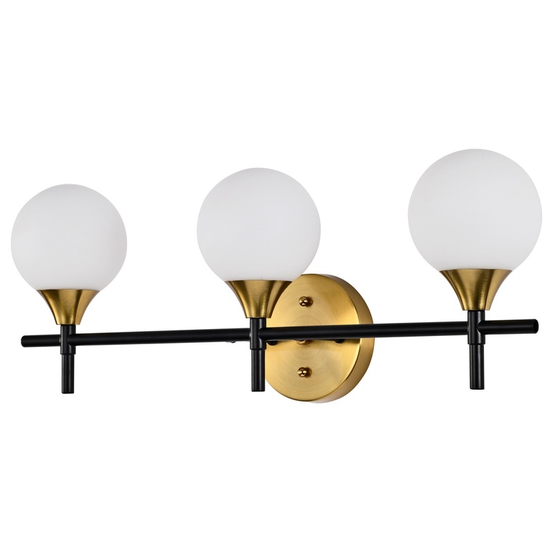 Allow the environment in your home to become a treat to be in with our 17-inch Matte Black and Brass Aeneas Wall Sconce. Garnished in Brass, our fixture features three (3) lights that are all housed in a glass Opaque White globe-style shade that brings thi