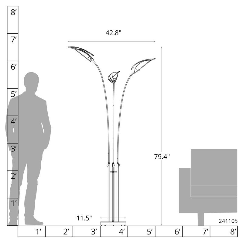 Three lovely stems culminating in beautiful white art glass flowers, the Aerial Torchiere designed by Ori Goldberg has a very botanical aesthetic. Light and airy, this adds a feminine touch while providing functional lighting with elegance. A vertical pole dimmer allows you to adjust the lamp’s brightness.