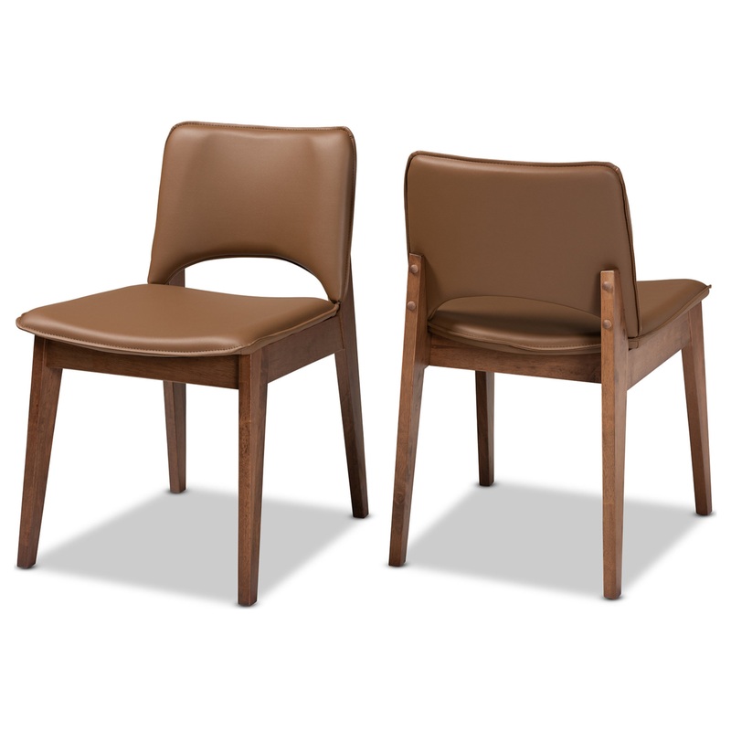 Dine in mid-century style with the Afton dining chair. Made in Malaysia, the Afton is constructed from walnut brown finished wood that exudes visual warmth. The backrest and seat are padded with plush foam and upholstered in smooth faux leather for superb comfort with every meal. Requiring assembly, the Afton utilizes slim, angled legs for stable support with a retro touch. With its chic, casual design, the Afton dining chair is an easy addition to any space.