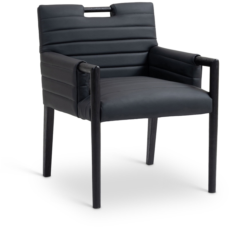 A perfect fusion of modern elegance and eco-friendly luxury is the Aimee vegan leather dining armchair. Upholstered in sleek vegan leather, this chair offers a chic, contemporary look while maintaining a commitment to sustainable living. The padded, quilted design featuring solid black wood legs and armrests creates a stunning contrast between its soft upholstery and minimalist frame.