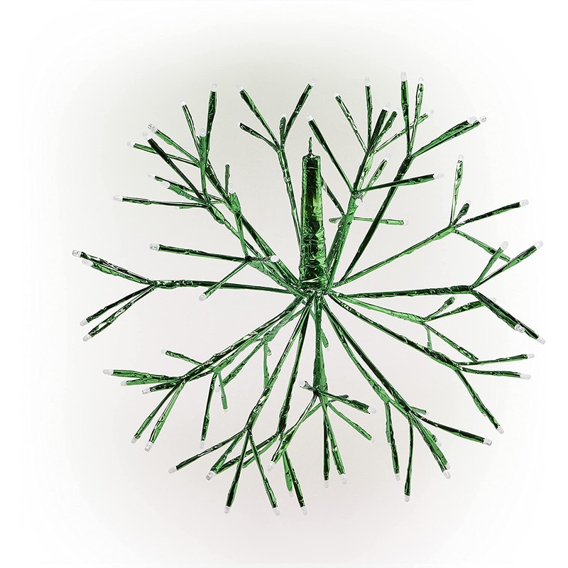 Upgrade your holiday decor with Alpines Hanging Snowflake Ornament! This ornament has a branching snowflake and is wrapped with green tape for a unique and stylish appearance. It features 84 green LED lights and 12 white flashing bulbs to provide a stunnin