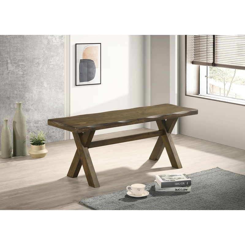 Crafted from solid rubberwood, this dining bench embodies rustic charm with its knotty nutmeg finish and worn edges that highlight the natural beauty of wood. The sturdy trestle-style base provides reliable support, while the smooth, contoured seat offers a comfortable place to gather. Designed for versatility, this bench slides neatly under the table when not in use, making it perfect for both spacious and compact dining areas. A timeless addition to any farmhouse, rustic, or traditional space.