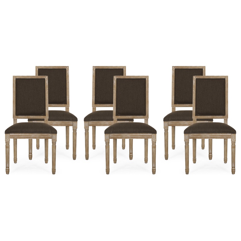 Turn your dining area into an old-world inspiration with sensible seating and stunning style. Drawing from French country influence, our set of six dining chairs feature an understated rectangular backrest, smooth upholstered seating, and fluted legs to of