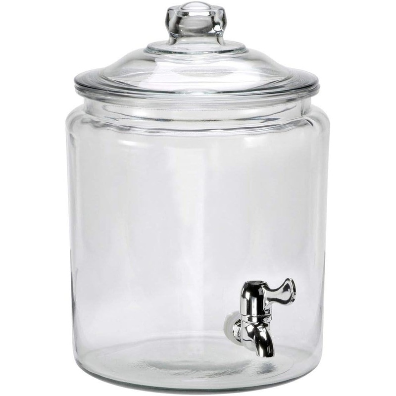 - INCLUDES: This Anchor Hocking glass jar set contains (1) 2-gallon Heritage Hill jar with (1) spigot and (1) glass lid. All-clear glass has oversized knob for easy gripping, a spigot for dispensing liquids, and a substantial weight to stay sturdy on the counter.