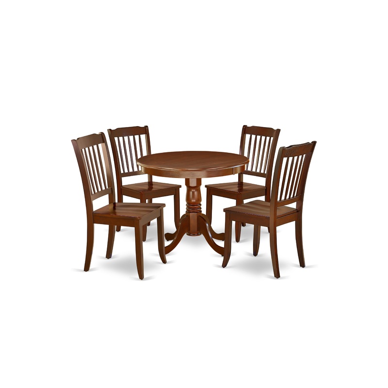 The ANDA5-MAH-W kitchen dinette set facilitates an affectionate family feeling. A comfy and luxurious Mahogany color offers any dining area a relaxing and friendly feel with the small dinette table. This small dining table require a very less space and itd be a great choice if you are struggling with the issue of space in your house. With a soft rounded bevel at the edge of the table top, this well-designed and comfortable small kitchen dinette table may be used for hours at a time. This amazing Mahogany kitchen table makes a really good addition for all kitchen space and corresponds all sorts of dining-room concepts. The eye-catching Danbury dining room chair finished in classy Mahogany offers a modern look in your dinette space. These Kitchen dining chairs come with a solid wood seat to fit personal preference and perfect design. The Stylish dining chair features curved front legs. The 7 vertical slats give any dining area a touch of class and sophistication. Made up of hardwood, the chair is stable and offers a sturdy finish. The frame of the chairs are engineered to offer a great amount of comfort to your spine and thus reduce the chances of back pain. The standard shape, size and design makes the dining area significantly attractive. This contemporary, budget friendly, durable and comfortable dining set can be good choice if you are looking for a great dining time experience with your family or friends.